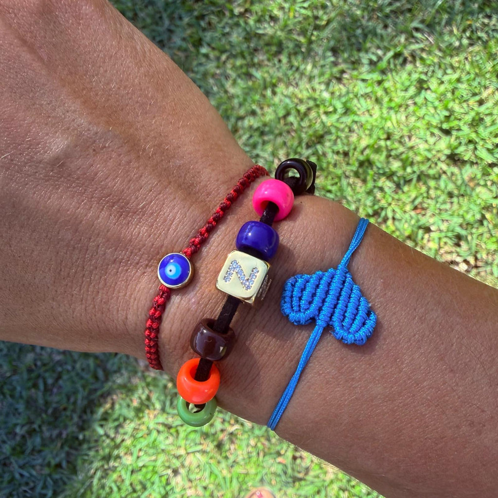 A suede cord and multicolored assorted beads attached to cubed charms dipped in 14k gold. Choose between 1-3 letters to create your own custom bracelet.