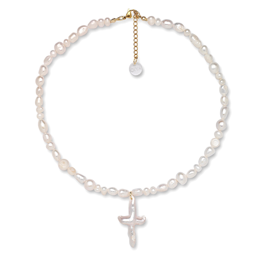 An assortment of raw pearls and a pearl cross pendant with a lobster clasp closure