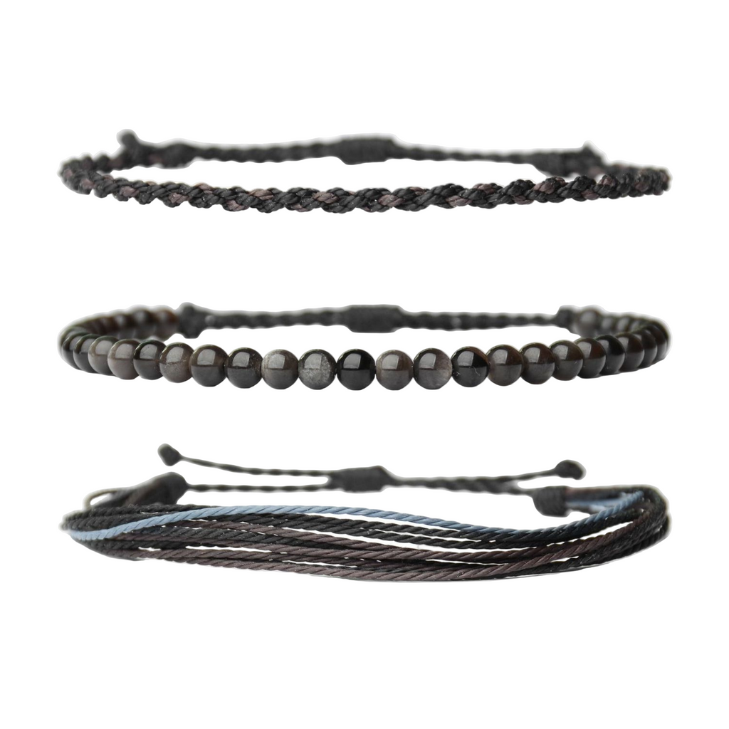 A bracelet bundle featuring hematite stones, wax-coated braided thread, and duo-color thread with a sliding clasp.