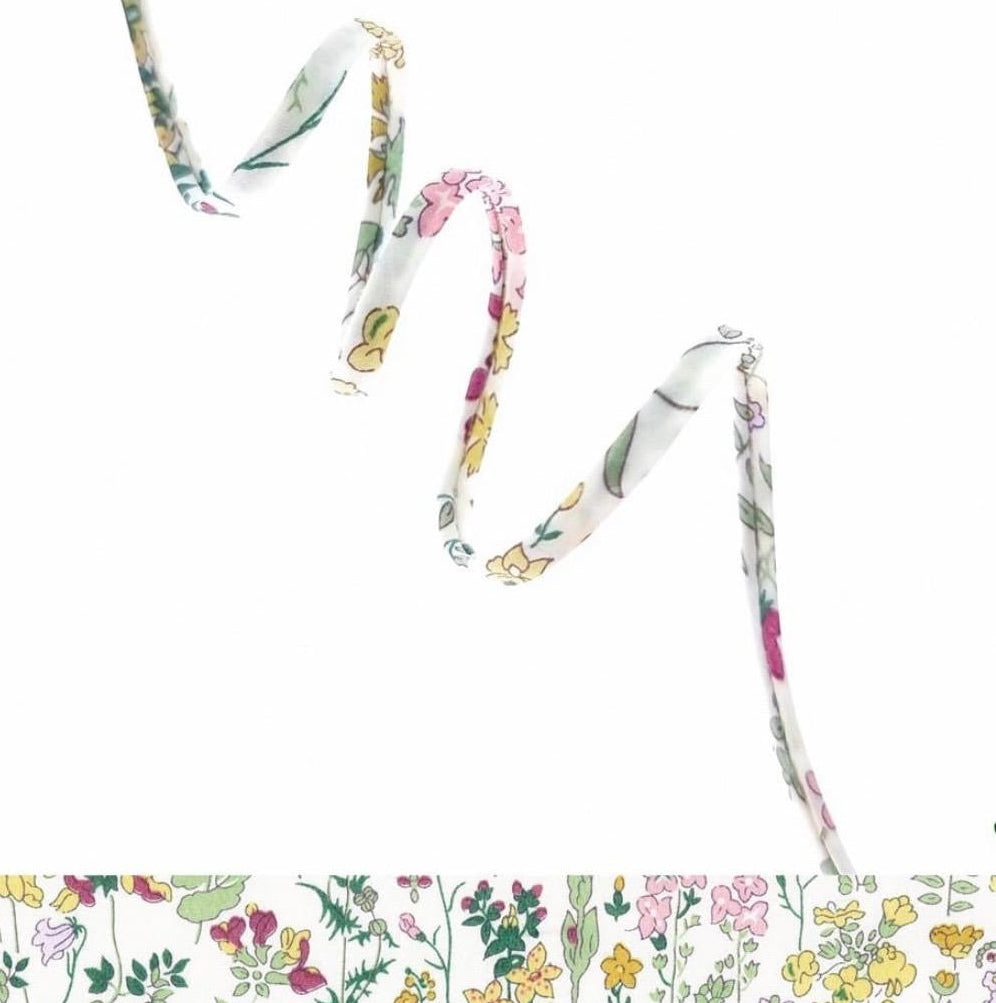 A heart-shaped gemstone pendant attached to a liberty print fabric necklace.