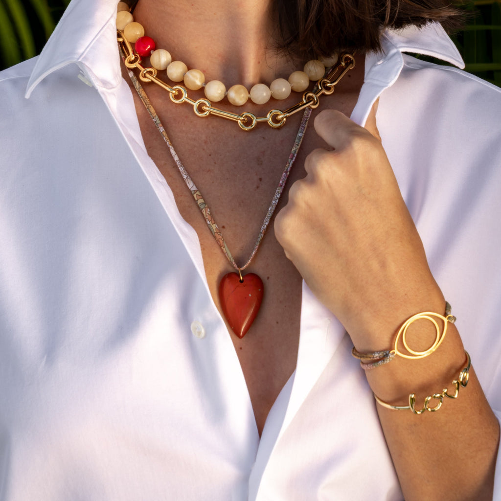 An assortment of neutral toned semi precious stones with a red accent bead with a lobster clasp closure.