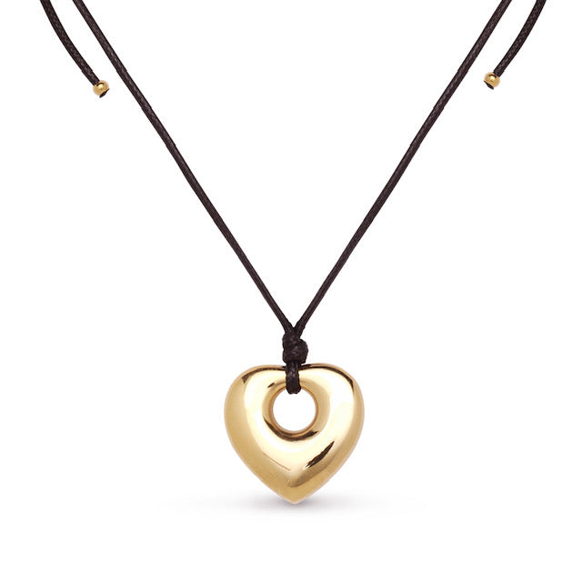 One medium sized gold heart pendant attached to a black suede cord necklace.